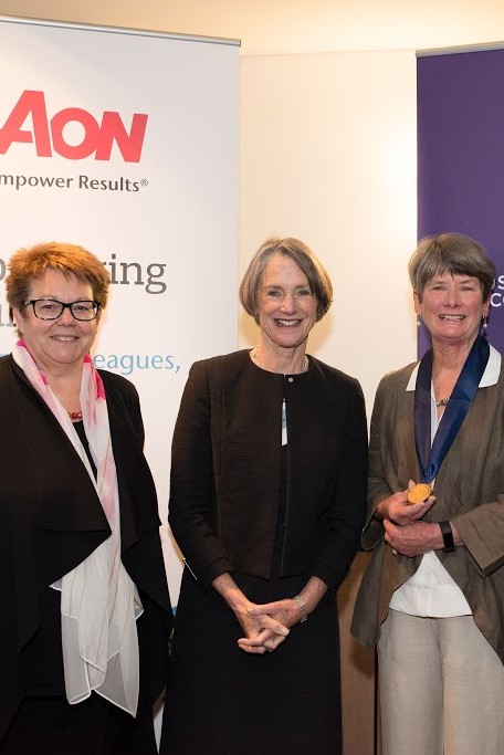 Award winner Lynn Mason, right, receives her gold medal from the Governor fo Tasmania Kate Warner and, inset, the medal.
